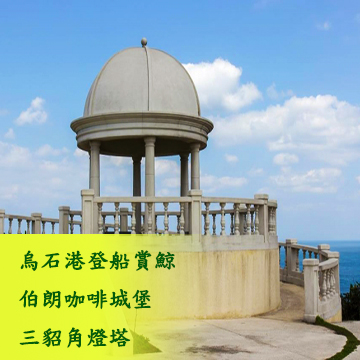宜蘭烏石港賞鯨伯朗咖啡城堡飛行傘三貂角燈塔包車一日遊行程規劃:冒險刺激的飛行體驗,乘著風飛翔在天空中,視野望去一片湛藍的大海,徐徐的海風吹拂我的臉龐,歡心愉悅享受體驗。 乘著船在海上,尋找著鯨豚的蹤跡,彷彿在與鯨豚玩著捉迷藏。在伯郎的咖啡城堡裡,品嚐一份悠閒!!! 來到三貂角燈塔,看著它一直在這默默守候著出海人,也引領期盼著 漁船滿載而歸的歸來~~~~~