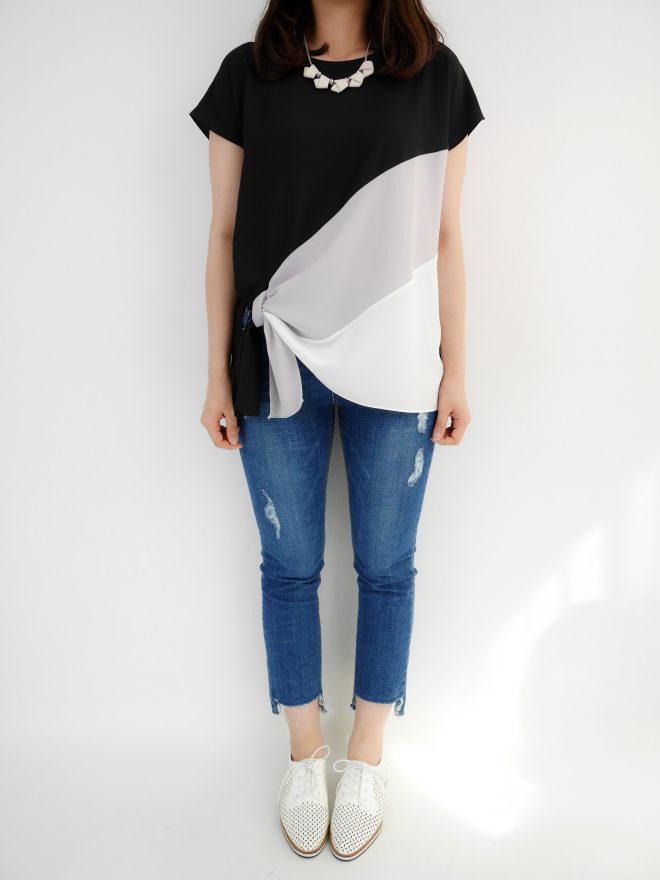 三色接拼打結雪紡上衣 – 黑色